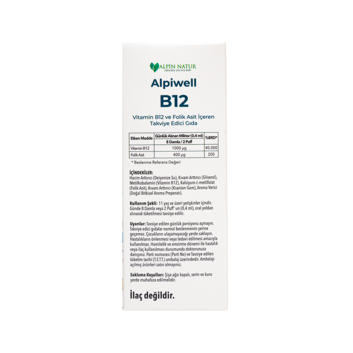 İÇİNDEKİLER: Hacim Artırıcı (Deiyonize Su), Kıvam Artırıcı (Gliserol), Metilkobalamin (Vitamin B12), Kalsiyum-L-metilfolat (Folat Asit), Kıvam Artırıcı (Ksantan Gam), Aroma Verici (Doğal Bitkisel Aroma Preparatı)