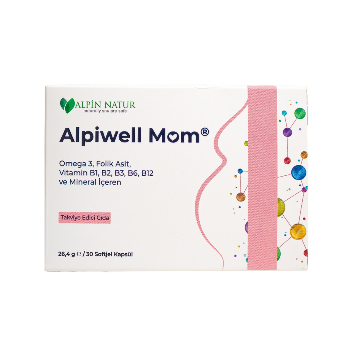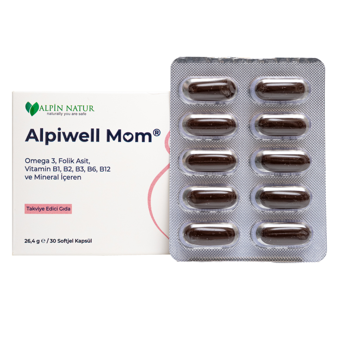 ALPİWELL MOM Omega 3, Folik Asit, Vitamin B1, B2, B3, B6, B12 ve Mineral İçeren Takviye Edici Gıda 26,4 g e / 30 Kapsül