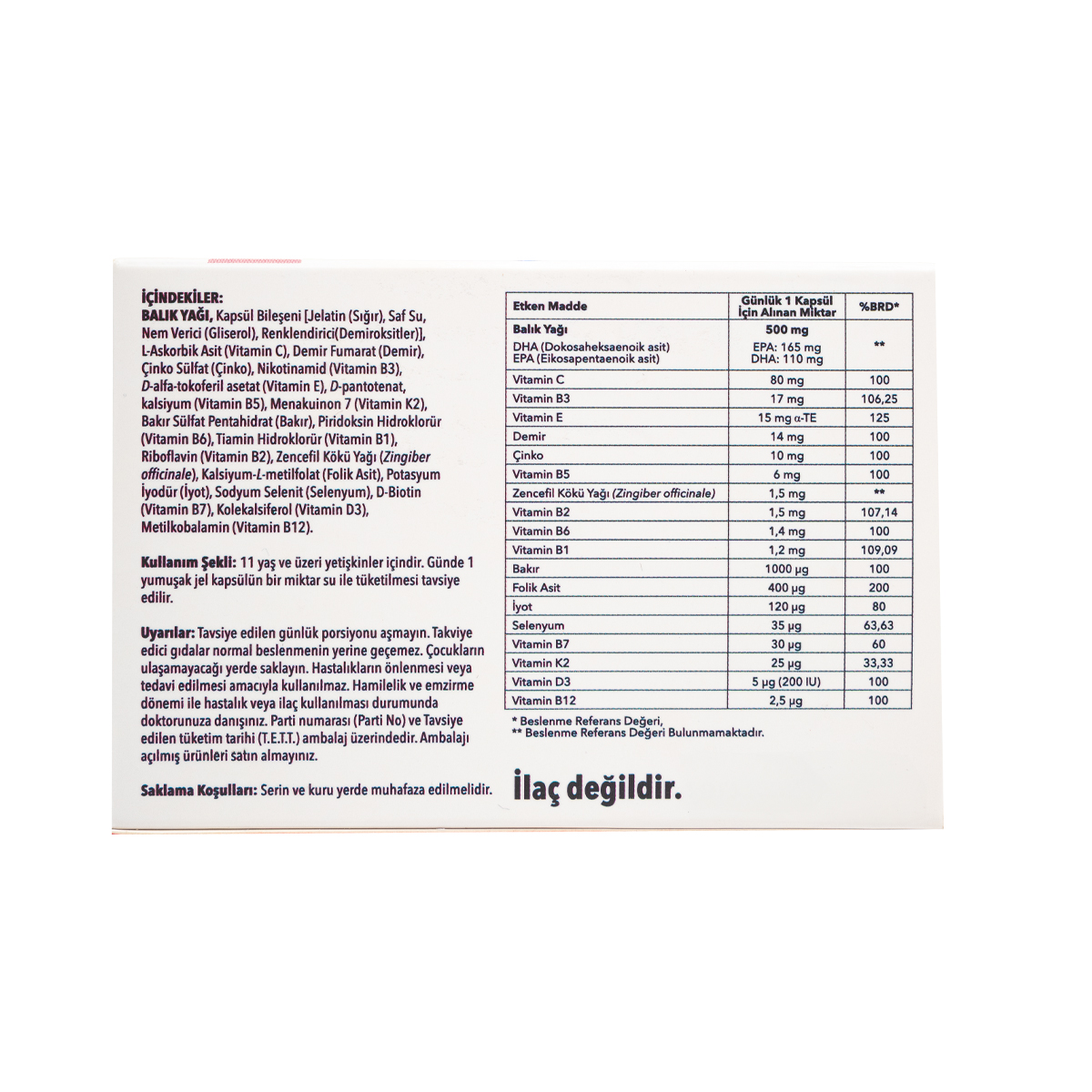 BALIK YAĞI, Kapsül Bileşeni Jelatin (Sığır), Saf Su, Nem Verici (Gliserol), Renklendirici (Demir oksitler), L-Askorbik Asit (Vitamin C), Demir Fumarat (Demir), Çinko Sülfat (Çinko), Nikotinamid (Vitamin B3), D-alfa-tokoferil asetat (Vitamin E), D-pantotenat kalsiyum (Vitamin B5), Menakinon-7 (Vitamin K2), Bakır Sülfat Pentahidrat (Bakır), Piridoksin Hidroklorür (Vitamin B6), Riboflavin (Vitamin B2), Tiamin (Vitamin B1), Sodyum Selenit (Selenyum), Potasyum İyodür (İyot), Folik Asit, Vitamin D3, Vitamin B12, Zencefil Kökü Yağı.